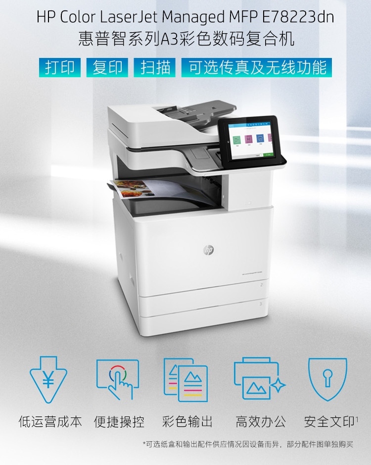惠普E78223dn A3彩色激光復合機:打印、復印、掃描、雙面器、雙面輸稿器、2紙盒