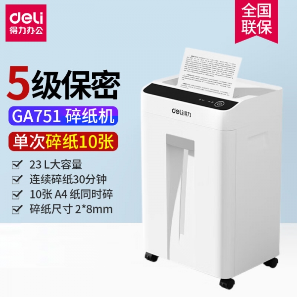 得力(deli)GA751碎紙機德國5級保密手動單次碎10張23L大容量文件粉碎機 可碎紙/訂書釘 10張 30分鐘